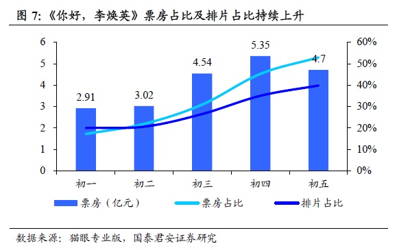《你好,李焕英》口碑自2021/2/14(初三)开始发酵,春节档期间票房占比和排片占比持续上升,至初五单日票房占比已超50%。根据猫眼专业版数据,《你好,李焕英》大年初一上映首日收获票房2.91亿元,票房占比17.2%,排片占比20.0%,至初三开始排片占比提升至26.5%,票房占比亦提升明显,到初五票房占比已达52.9%。