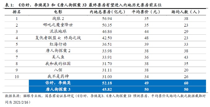 《你好,李焕英》和《唐人街探案3》的最终票房成绩有望进入内地历史票房前五位。参考猫眼专业版的预测数据,若《你好,李焕英》和《唐人街探案3》最终票房成绩为52.18亿元和45.82亿元,则有望进入内地历史票房前五,其中《你好,李焕英》仅次于《战狼2》位居次席,《唐人街探案3》超越《复仇者联盟4:终局之战》,排进第五名。