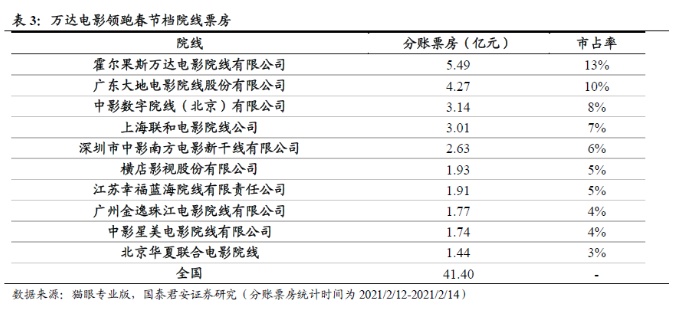 从院线来看,万达电影领跑春节档票房,初一至初三实现分账票房5.49亿元,市占率达13%。根据猫眼专业版的数据,万达仍为2021年春节档分账票房和市占率最高的院线,其次为大地电影,中影数字、上海联合电影、中影南方电影新干线,初一至初三市占率分别为10%/8%/7%/6%。
