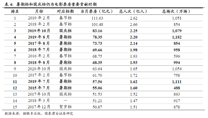 2021年为建党百年,相关题材电影或在暑期档上映,推动全年票房增长。暂不考虑2021年票房,从单月票房来看,除春节档外,暑期档和国庆档为重要电影档期。2019年建国100周年时,国庆档实现票房43.8亿元,同比增长129%,国庆档当月实现票房83.16亿元,成为仅次于2018/2019年春节档当月的关键票房贡献月份。2021年为建党100周年,多部反映我党奋斗历程的电影或将在暑期档上映,叠加暑期档本身较强的票房号召力,我们认为有望拉动7-8月的电影票房。