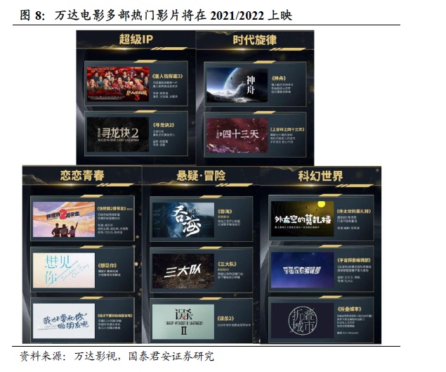 聚焦在公司层面,2021年春节档表现优秀的万达电影有多部热门影片将在2021-2022年上映。参考万达影视集团公布的片单,除已上映的《唐人街探案3》外,《寻龙诀2》、《神州》、《上甘岭之四十三天》、《误杀2》等均有望在近两年登陆大银幕,其中由陈思诚导演的《外太空的莫扎特》或在2021年暑期档上映,有望推动2021年票房上涨。