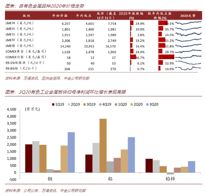 2020年下半年以来,金属价格高位运行,上市公司四季度利润修复确定性较高。截至2020年12月31日,工业金属板块整体表现较为亮眼,2020年LME铜/铝/铅/锌价收盘于7753/1981/1989/2749美元/吨,较年初上涨25%/10%/4%/19%,且去年的价格基本呈现先抑后扬的走势。根据我们去年三季度行业业绩回顾,铜/铝/铅锌板块单季度净利润反弹明显,环比分别+50%/+112%/+95%,我们预计四季度将延续三季度的趋势,各板块上市公司业绩仍有望实现较大增长。