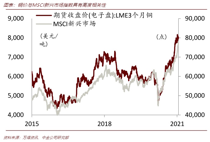 铜需求的增量主要来自新兴市场的需求。根据Woodmac统计,2019年中国占全球精炼铜消费的51%,比例占到一半,而2020年下半年国内市场的铜需求集中释放,这其实也解释了为什么在海外需求并未完全修复的情况下,下半年铜价依然继续维持高位运行的原因。事实上,铜价和MSCI新兴市场指数具有高度相关性。展望2021年,我们预期中国的铜需求仍然平稳向好,但是需求增量更多的是来自于发达国家的经济复苏。