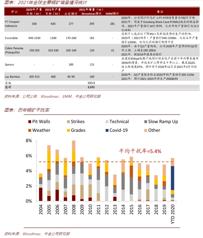 “高”供给增速值得商榷,供给干扰因素不可忽视。我们整理2021年全球主要铜矿新增产量151万吨,新增产能较大,但同时,我们需提示注意铜矿历史上干扰率也较高,根据woodmac,2004-2020平均干扰率约为5.4%。关于今年的干扰因素我们认为主要需考虑以下几点:1)今年新增产量地区多分布于拉美、非洲等地区,我们测算这两个地区2020年产量增量占比分别为59%和21%,即便发达国家已经开始疫苗接种,今年疫苗或仍将无法完全覆盖发展中国家。近期南非病毒变异,未来拉美、非洲等地疫情控制或仍存在风险。即便疫情影响逐渐消退,各大项目建成投产到满产生产仍需一个产能爬坡的过程。2)2020年铜矿罢工事件较多,例如Escondida和Candelaria。3)社区事件也会影响矿山生产,例如Las Bambas矿山2020年由于社区堵路事件造成近半年的生产受阻,且于2020年12月底再次出现堵路事件。但考虑2020年干扰率与低基数效应影响,我们预计2019-21年复合增速为2.2%,全球铜精矿整体增速依然较为缓慢。