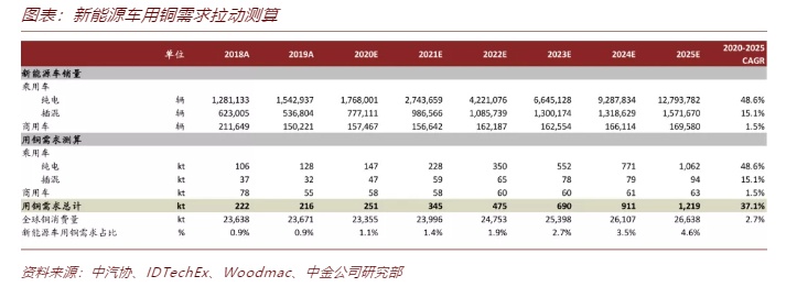 新兴需求:随着电气化的提升,铜作为导电性较好的大宗商品,我们看好长期的需求提升。根据IDTechEx,假设乘用车BEV/PHEV单车耗铜量为83/60kg,商用车单车耗铜量为369kg,结合中金汽车组对全球新能源车销量判断,我们测算2021年全球新能源车用铜需求在34.5万吨,占全球铜总消费量1%不到,往后用铜量逐年增大,2025年将达到121.9万吨,2020-2025年CAGR为37.1%,占全球铜总消费量4.6%,成为全球铜需求增量的重要来源。