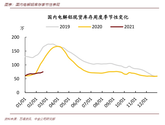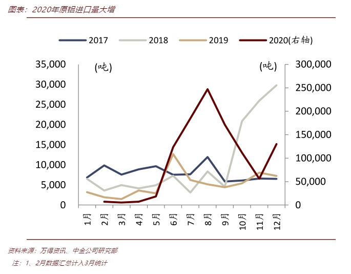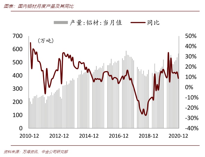 电解铝供给增速高,不代表铝价低,核心在于需求的强度。从2020年铝表观消费量测算观察到,去年国内需求旺盛,下半年来平均同比增速在10%以上,反映国内疫情控制较好,企业复工赶工深化,整体需求反弹较大,而去年铝材进口多、出口少的数据也支撑了这个结论。所以,虽然下半年以来,电解铝新增产能投放较多,但在国内需求支撑下,截至2021年2月10日,沪铝价格15,900元/吨,较去年年初上涨12.8%,较3月低位上涨40%。