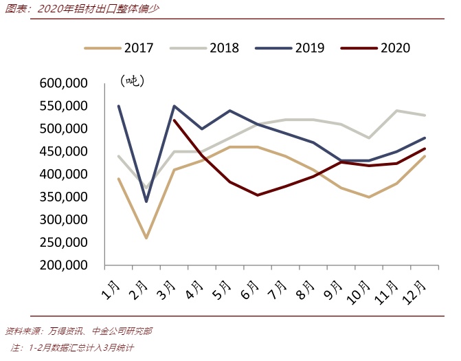 国外方面,2020年铝材出口有所回落,今年随着疫苗落地,海外疫情得到控制后复工赶工进度或将加快,海外经济的复苏则有望带动铝材出口增长,我们认为2021年需继续关注这一核心变量。根据海关统计,2018/2019/2020的铝材出口量分别为580/574/419万吨,2020出口量较去年同期同比下降27%,我们预计今年出口有望实现较高增速。