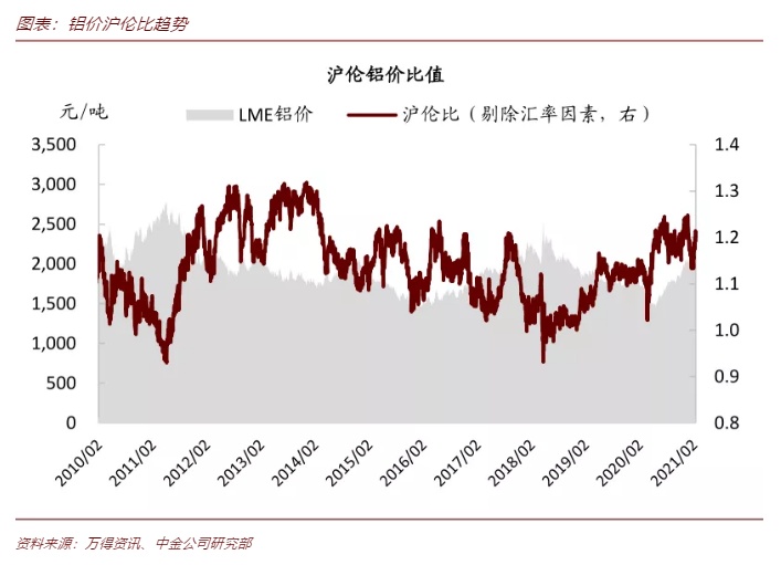 国内方面,整体宏观基本面稳定复苏,经济情况持续向好,2020年我国铝材产量达5165万吨,同比增速达15%。截至2月10日,铝价沪伦比为1.15,沪伦比高于1说明国内铝整体供需格局好于国外,继续验证了国内需求恢复较好的现在。铝下游需求结构中,地产、建筑、汽车等主要行业环比增速较高,中金地产组预计2021年竣工面积同比增长 8%,较 2020 年增速(3%)上行,中金汽车组预计2021年国内乘用车销量有望在2020年的低基数上录得10%以上高速增长。