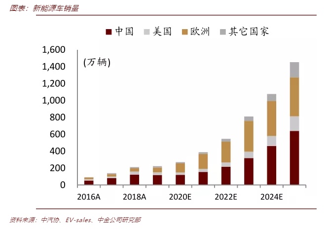 根据中金汽车组预测,2021/2022年全球新能源车销量389/547万辆,同比增长43.8%/40.7%,而到2025年全球新能源车销量将达到1,453万辆,2020-2025年CAGR为40.0%,其中,国内销量640万辆,2020-2025年CAGR为39.6%;海外销量813万辆(欧洲占比56.8%),2020-2025年CAGR为40.3%。