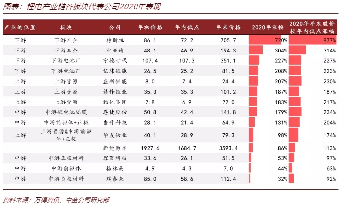 盘点2020年锂电产业链股价表现,新能源车产业链景气度高企,拉动原材料需求上涨,上游有色板块主要标的表现靓丽。2020年,新能源车指数整体涨幅在86%,根据我们统计,下游车企和电池厂以及上游资源企业明显跑赢整体指数。下游车企中,我们以特斯拉和比亚迪(01211)为代表,2020年涨幅分别为720%和304%;其次为宁德时代、亿纬锂能等电池厂,2020年涨幅分别为227%和208%;赣锋锂业(01772)/华友钴业/雅化集团/盛新锂能作为上游资源企业,2020年涨幅分别为187%/98%/183%/207%。