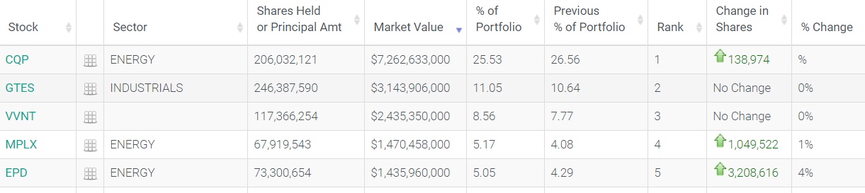 前五大重仓股中:钱尼尔能源合伙公司(CQP.US)位列第一,持仓约2.06亿股,持仓市值约72.63亿美元.