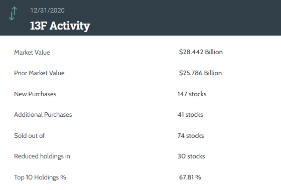 第四季度,黑石集团持仓总市值为284.42亿美元,上一季度为257.86亿美元,环比增长10.3%。持仓新增标的147只,增持41只标的,减持30只标的,清仓74只标的。截止至2020年12月31日,该基金前十大持仓标的占总市值的67.81%。