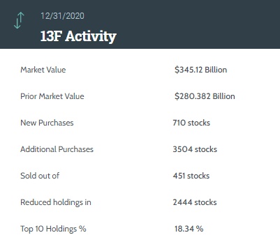 据统计,加拿大皇家银行Q4持仓总市值为3451.2亿美元,上季度为2803.82亿美元,环比上升约23.09%。持仓组合中新增了710只标的,增持了3504只标的,减持了2444只标的,清仓了451只标的。前十大持仓标的占总市值的18.34%。