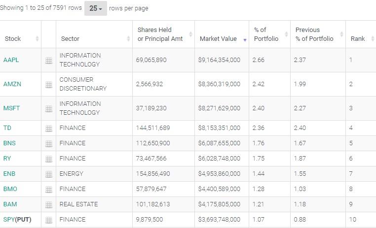 按加拿大皇家银行Q4持仓市值排名,前5大重仓股分别为苹果(AAPL.US)、亚马逊(AMZN.US)、微软(MSFT.US)、多伦多道明银行(TD.US)及丰业银行(BNS.US),分别占仓位比重的2.66%、2.42%、2.40%、2.36%、1.76%。