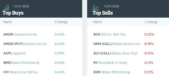 前五大卖出标的分别是:加拿大贝尔(BCE.US)、罗素2000指数ETF看涨期权(IWM.US,CALL)、白银ETF看涨期权(SLV.US,CALL)、加拿大银行、新兴市场ETF(EEM.US)。