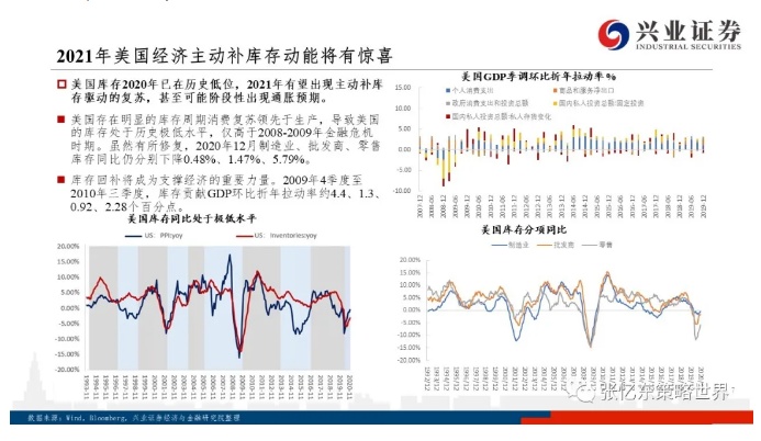 2021年美国经济主动补库存动能将有惊喜。美国库存2020年已在历史低位,2021年有望出现主动补库存驱动的复苏,甚至可能阶段性出现通胀预期。美国存在明显的库存周期消费复苏领先于生产,导致美国的库存处于历史极低水平,仅高于2008-2009年金融危机时期。虽然有所修复,2020年12月制造业、批发商、零售库存同比仍分别下降0.48%、1.47%、5.79%。库存回补将成为支撑经济的重要力量。2009年4季度至2010年三季度,库存贡献GDP环比折年拉动率约4.4、1.3、0.92、2.28个百分点。