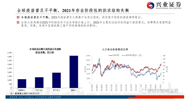 全球疫苗普及不平衡,2021年存在阶段性的供求结构失衡。2021年主要发达经济体得益于疫苗普及,消费需求有望明显复苏,但是,发展中国家的复工复产仍受疫情的较多影响。全球大宗周期品2021年阶段性供不应求导致价格上行。