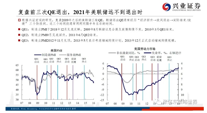 根据兴证宏观的研究,复盘2009年之后的美联储三轮QE,联储退出QE通常经历“经济回升→放风退出→实际结束/放缓”三个阶段间。这三个时间段通常两两间隔半年左右的时间。
