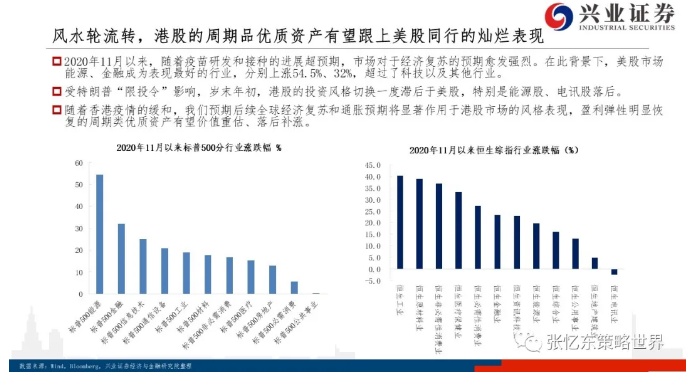 2020年11月以来,随着疫苗研发和接种的进展超预期,市场对于经济复苏的预期愈发强烈。在此背景下,美股市场能源、金融成为表现最好的行业,超过了科技以及其他行业。受特朗普“限投令”影响,岁末年初,港股的投资风格切换一度滞后于美股,特别是能源股、电讯股落后。