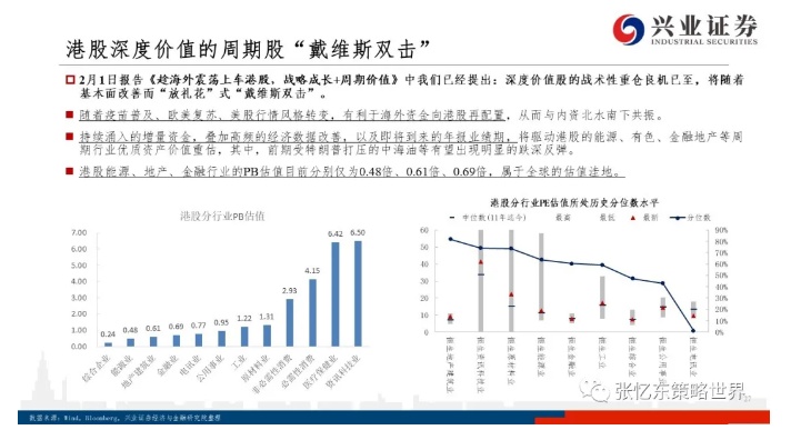 港股深度价值的周期股“戴维斯双击”。2月1日报告《趁海外震荡上车港股,战略成长+周期价值》中我们已经提出:深度价值股的战术性重仓良机已至,将随着基本面改善而“放礼花”式“戴维斯双击”。