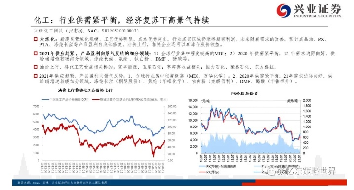 2021年上半年与欧美需求相关的尤其是与欧美服务消费相关的大宗商品,价格弹性会更大,对应的原油、化工、铜等相关产业链上市公司的盈利反弹有望超预期。