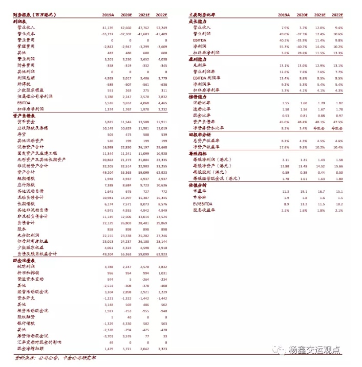 受益于疫情期间中国行业整体恢复速度快,且出口持续维持较高景气,我们预期公司2020年业务整体发展平稳,2020-2022年公司营收同比+4%/+12%/+9%,净利润同比-41%(2019年香港货仓处置收益高基数)/+14%/+10%,核心净利润同比+29%/+12%/+13%,分业务来看,具体如下: