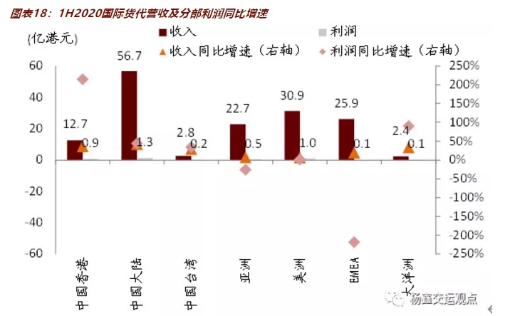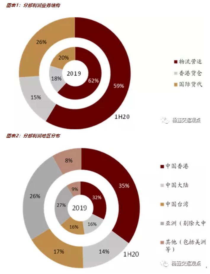 公司主营综合物流和国际货代。公司主营业务可分为:综合物流(IL)业务,包括香港货仓(HKW)与物流营运(LOP);国际货代(IFF)。2019年物流运营、国际货代、香港货仓业务分部利润分别为18.9亿港元(占比62%,2014-2019年复合增速14%)、6.2亿港元(占比20%,2014-2019年复合增速13%)、5.4亿港元(占比18%),1H2020分别占比59%、15%、26%。区域分布上,2019年中国香港、亚洲(剔除大中华)、中国台湾、中国大陆、其他区域(包括美洲、欧洲等)分别占比32%、27%、16%、16%、9%;1H20分别占比35%、26%、17%、14%、8%。