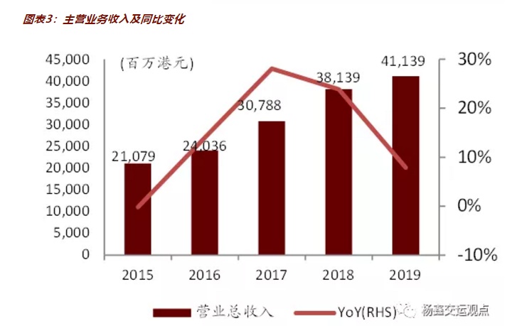 公司从事综合物流与国际货代业务,2019年物流运营/香港货仓/国际货代分别贡献利润的62%/18%/20%。公司继承国际化基因,全球铺设物流网络、积累B端头部客户,2019年发展为物流行业营收亚洲第九,海运货代全球第六。公司过去五年营收/净利润复合增速14%/18%,2019年净利润38亿港元(剔除货仓出售一次性影响净利润19亿港元)。