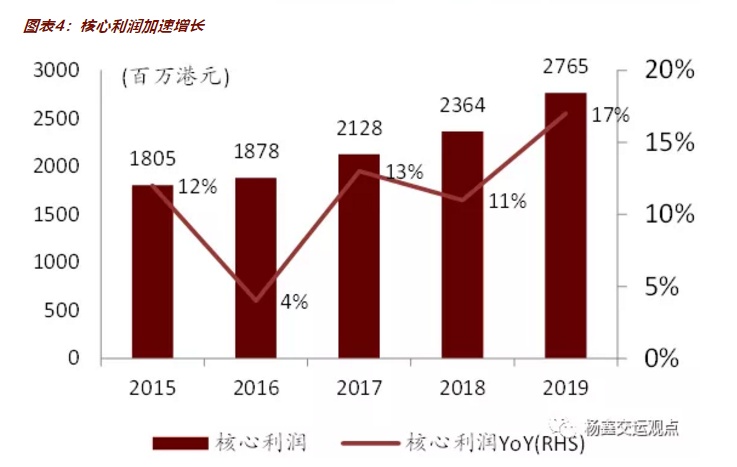 历史增长稳健,2019年以来加速。2019年营收411.4亿港元(2014-2019年复合增速14%);1H20同比增长10%;2019年核心利润27.7亿港元(过去五年复合增长率为11%);1H20同比增加12%。2019年净利润37.9亿港元(过去五年复合增长率为18%);1H20尽管1Q受疫情影响,同比仍增长8%。驱动因素上看,过去三年亚洲(除大中华地区)的物流营运业务与亚洲以外地区的货代业务增长较快,分别受益于泰国快递业务的强劲发展和全球无船承运商Apex的收购。