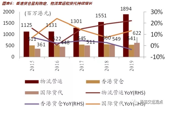 香港货仓业务主要给用户提供短期和长期的租赁服务,利润主要来源于稳定的租金(贡献分部利润稳定在5亿港元左右)。过去五年利润同比增速3%,占分部利润的17.7%。此外香港货仓在报表中作为公司的投资性房地产列示,每年有可观的公允价值变动损益列入非核心盈利中(2013年以来投资性房地产公允价值变动损益在5-10亿港元之间波动)。这一部分也将在顺丰收购同时、剥离出上市公司体外。