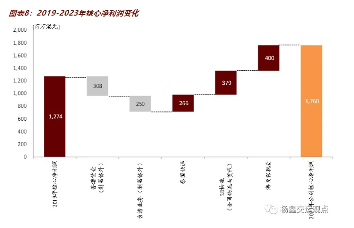 公司将缺少香港货仓与台湾业务贡献的利润(2019年我们估计两者合计贡献公司净利润5.6亿港元,其中香港货仓贡献3.1亿港元、台湾业务贡献2.5亿港元),同时由于香港货仓以作为投资性房地产贡献的公允价值变动收益也不再有(2018年贡献非核心利润4.8亿港元,香港货仓贡献了大部分投资性房地产公允价值收益,我们保守假设该科目为零,则未来公司核心净利润约等于净利润值);