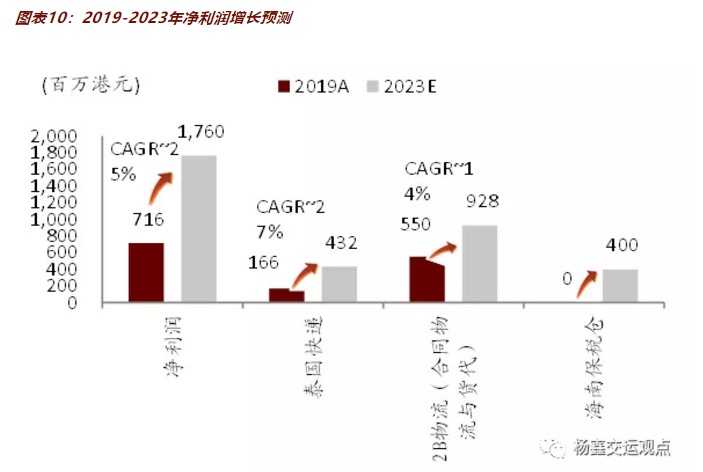 收购完成后,我们预计2023年公司净利润将达到17.6亿港元(可比口径下利润加速增长,2019-2023年复合增速或达25%),其中To B物流(合同物流和货代)贡献9.28亿港元净利润(占比53%),泰国快递贡献4.32亿港元(占比25%)、海南保税仓贡献4亿港元(占比23%)。