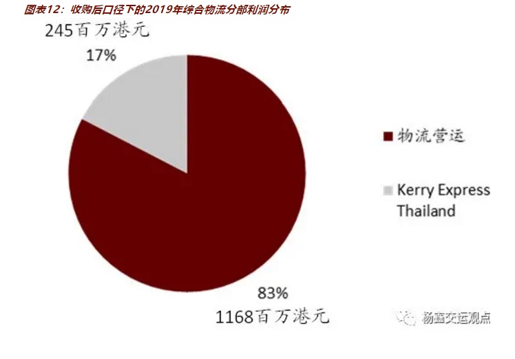 而未来顺丰完成收购后,嘉里物流将香港货仓与台湾业务出售给母公司、剥离至上市公司体外。现有业务保留剔除台湾地区的物流运营业务和货代业务,快递在综合物流业务分部利润中的比重上升至17%,而2B物流仅保留除台湾地区外的合同物流,贡献分部利润占比至83%(对应11.7亿港元)。(图表12)