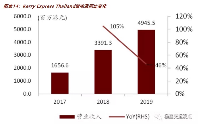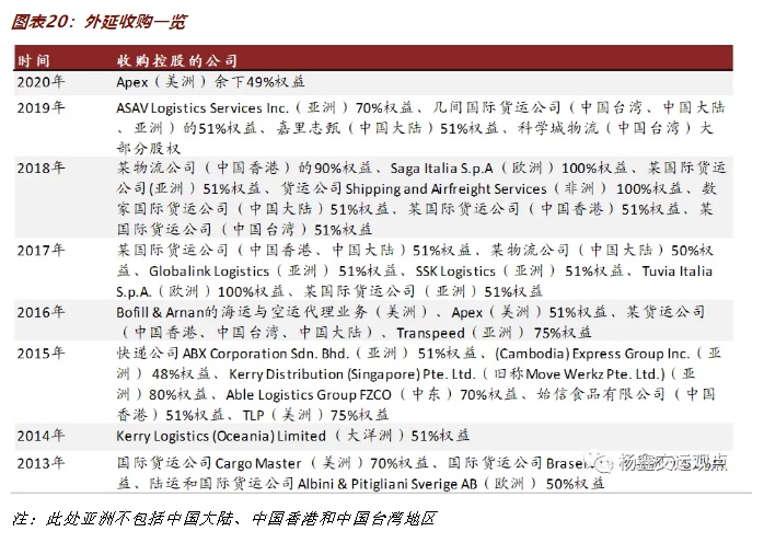 2000年后,公司走出中国香港,提升全球物流业务实力。2005年公司收购嘉里大通(从事中国大陆地区物流业务),2010年收购嘉里大荣(主营中国台湾地区物流业务)开拓了公司在中国大陆和中国台湾的物流业务。公司近年来在体内培育了亚洲地区(除大中华地区外)的快递业务,并于2020年将从事泰国快递业务的子公司Kerry Express(KEX)拆分并在泰国上市,成为公司东南亚物流业务进展的一块里程碑。同样在2020年公司收购Apex Group全部股权(从事国际货代业务,是往返亚洲美洲的第二大无船承运商),推动亚洲外物流业务的进一步扩张。