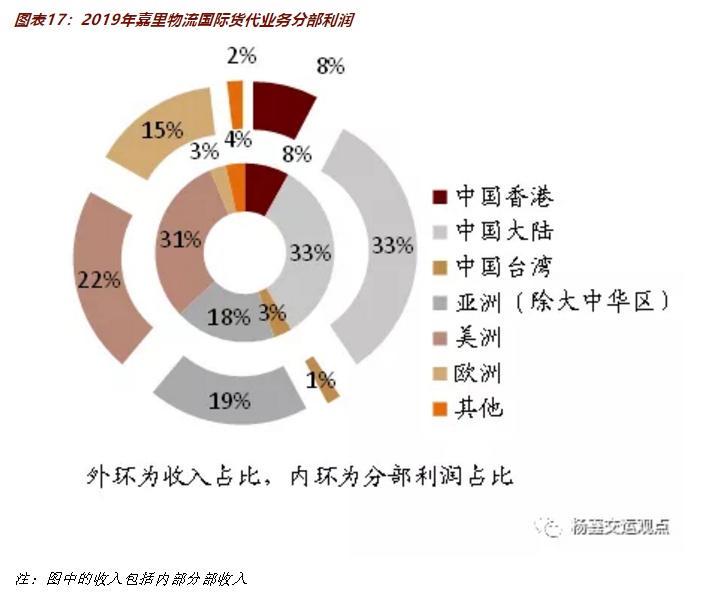 2019年,嘉里物流国际货代业务营收达216亿港元,占总营收的52%,分部利润达6亿港元,占分部利润的20%。分地区看,大中华区、亚洲(除大中华区)、美洲、欧洲、其他地区分别贡献营收和分部利润的42%、19%、22%、15%、2%和44%、18%、31%、3%、3%。过去五年得益于外延并购和龙头获得份额,货代分部利润复合增速约13%。