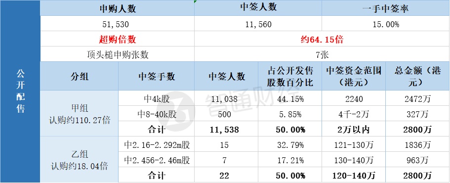 其中,公开配售申购人数51530人,一手中签率15%,超购倍数约64.15倍。