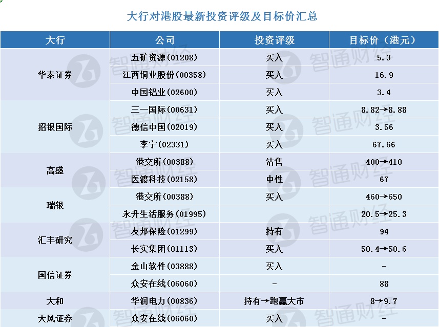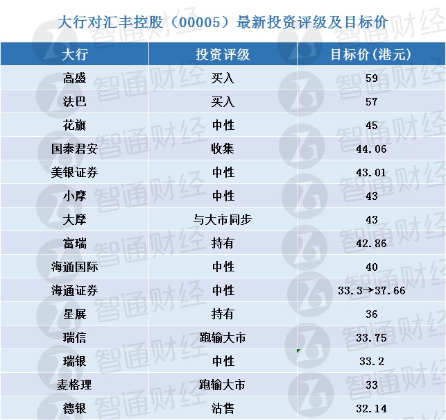 二、大行对汇丰控股(00005)最新投资评级及目标价