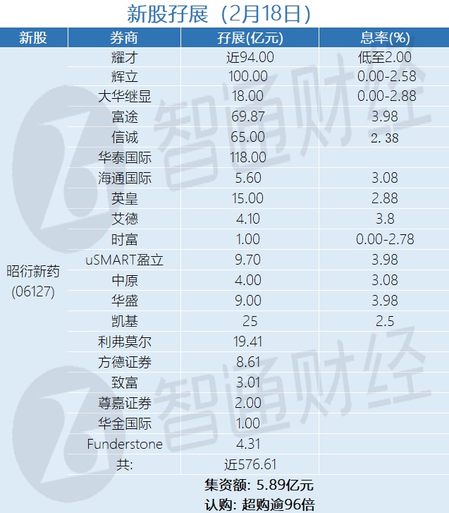 智通财经APP获悉,昭衍新药(06127)正在招股中。截至2月18日,辉立、耀才、信诚等合计为其借出近576.61亿港元,超购逾96倍。