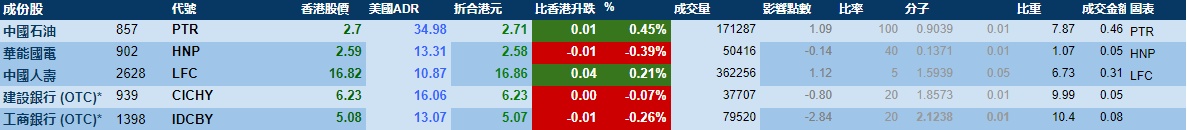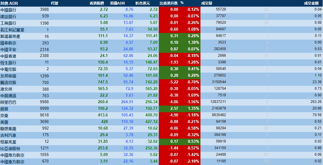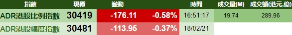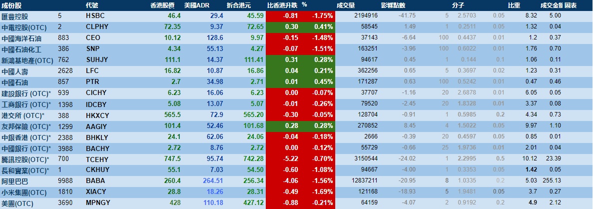 智通财经APP获悉,周四美股三大指数齐跌,港股ADR指数下挫,按比例计算,收报30419点,跌176.11点或0.58%。