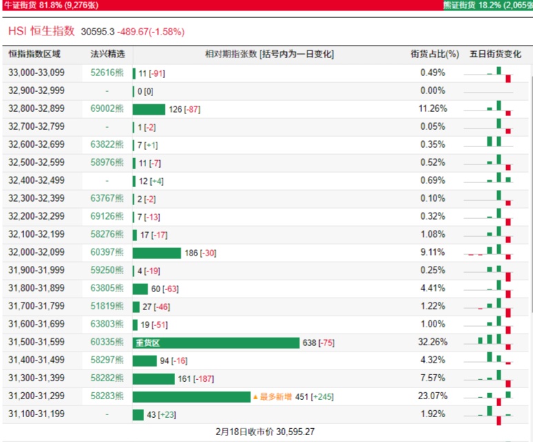 智通财经APP获悉,截至2月19日,恒指最新的牛熊街货比例为82:18。