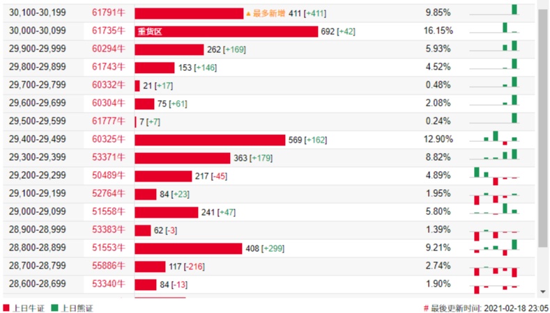 法兴恒指牛熊证街货分布图中的数据显示,熊证街货重货区在31500-31599区间,该区间最新熊证数量为638张,较上一交易日减少75张,最多新增在31200-31299区间,熊证数量为451张,增加245张。牛证街货重货区在30000-30099区间,该区间最新牛证数量为692张,较上一交易日增加42张。最多新增在30100-30199区间,该区间最新牛证数量为411张,较上一交易日增加411张。