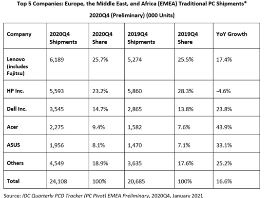 智通财经APP获悉,日前,国际数据公司(IDC)公布数据显示,欧洲、中东和非洲(EMEA)的传统个人电脑市场(台式机、笔记本电脑和工作站)在2020第四季度实现强劲增长,同比增幅16.6%,销量达到2410万台。