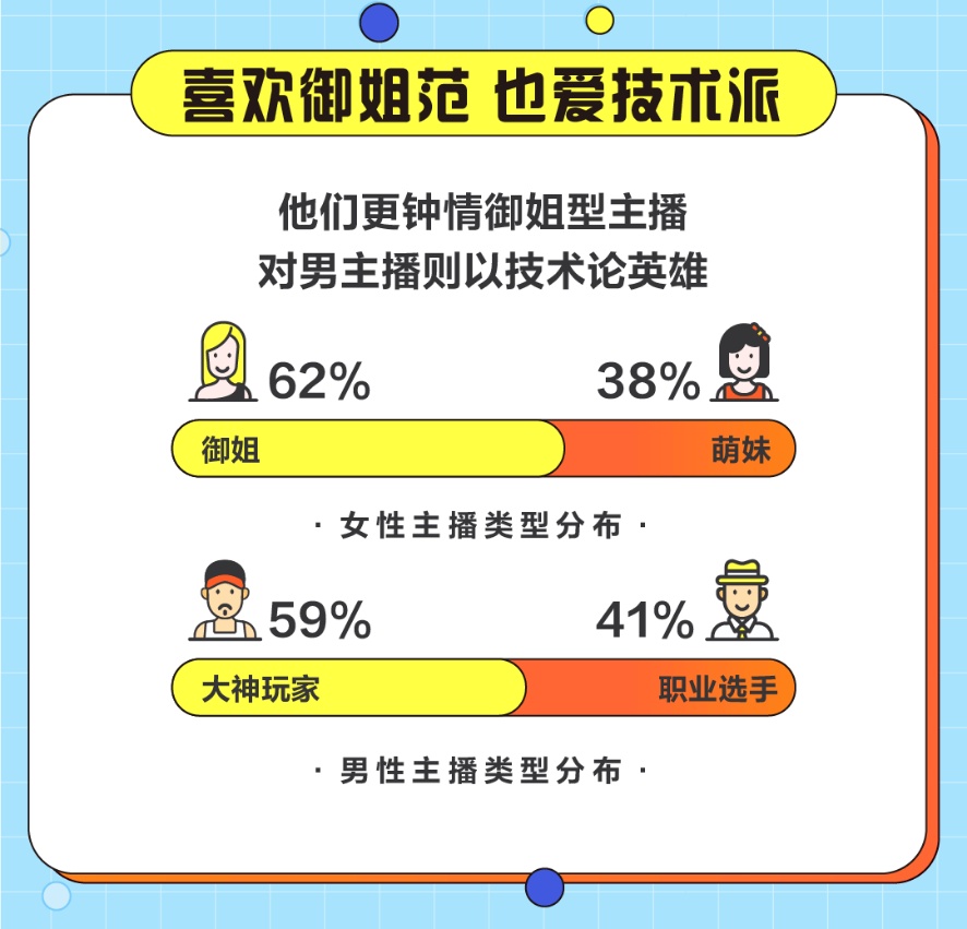 斗鱼发现,游戏直播用户喜欢观摩大神玩家和职业选手的精彩操作,同时也钟情于颜值高、才艺多的女主播们。在男性主播中,技术流最受用户欢迎,喜爱大神玩家的用户占比达59%。但在女性主播中,萌妹类型主播却不是最“吃香”的,反而是成熟、霸气的御姐范主播更受喜爱,有62%的用户钟爱这一型。