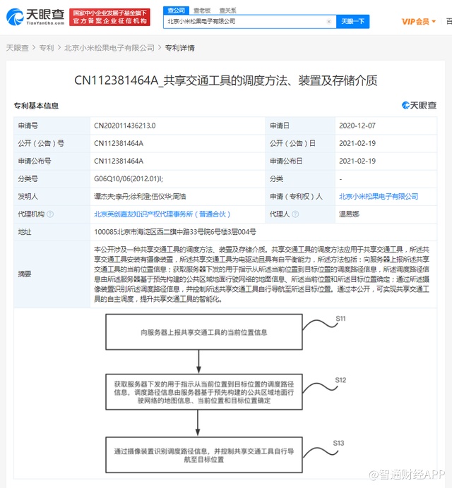 智通财经APP获悉,据天眼查App显示,2月19日,北京小米松果电子有限公司公开一项名为“共享交通工具的调度方法、装置及存储介质”发明专利,公开号为CN112381464A,申请日期为2020年12月。