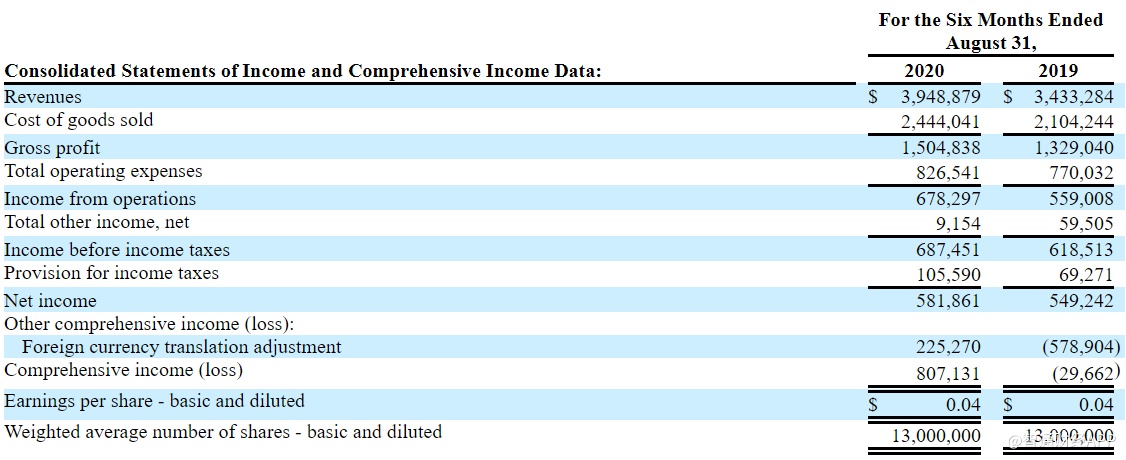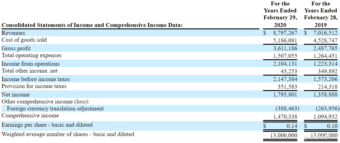 截至2020年2月29日的财年里,公司营收为879.73万美元,上年同期为701.65万美元;净利润为179.58万美元,上年同期为135.89万美元;基本和摊薄每股收益为0.14美元,上年同期为0.10美元。