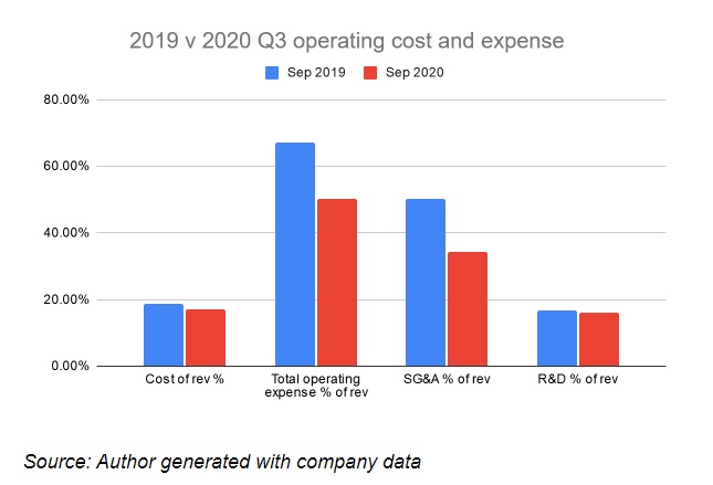 而下面的柱状图显示了2019年第三季度和2020年同期的年度运营成本和费用比较。必须指出的是,与上述总体年度数据相比,最值得注意的是,Airbnb在研发支出面的显著改善。第三季度该部分的减少降低了整体运营费用,使公司进入盈利领域。