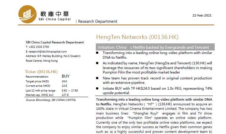 志在打造成为中国版奈飞的恒腾网络(00136)获资本市场看好。2月22日,专业机构软库中华发布研报,给予恒腾网络买入评级,目标价24港元,潜在涨幅超70%。