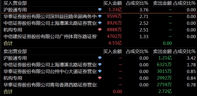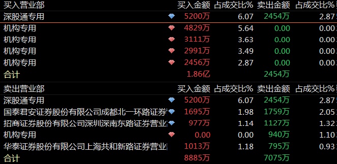 中国中冶(601618):一家机构买入8887万元,买一是沪股通专用席位买入1.33亿元,一家机构卖出2992万元,卖一是沪股通专用席位卖出1.21亿,沪股通专用席位在对倒,从承接来看非常强劲,而且封单稳定。