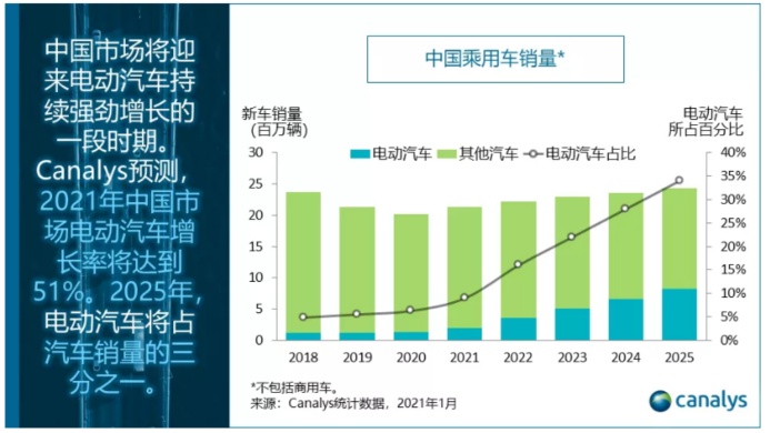 Canalys预测,2021年中国将售出190万辆电动汽车,增幅高达51%,占中国汽车总销量的9%。