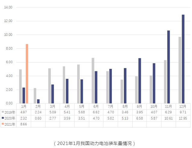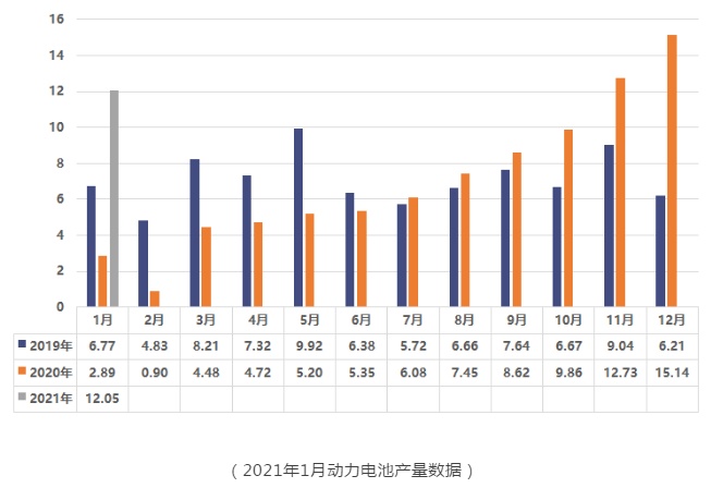 智通财经APP获悉,2月23日,中国汽车动力电池产业创新联盟发布了2021年1月新能源汽车电池产销量及装车量数据。数据显示,1月,中国动力电池产量共计12.0GWh,同比上升317.2%,环比下降20.4%;动力电池装车量共计8.7GWh,同比上升273.9%,环比下降33.1%。